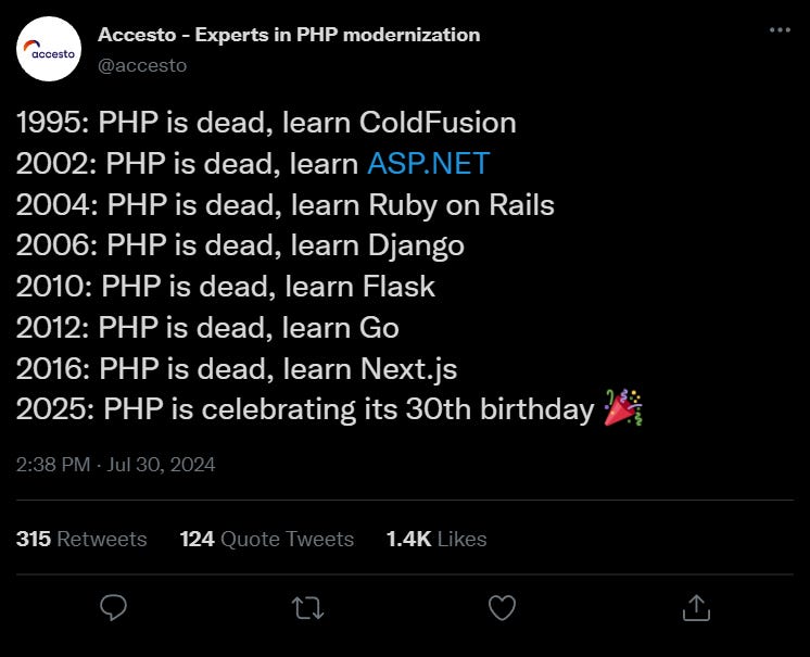 In the first edition, I will focus on PHP's place in the modern web development scene. The reason for focusing on this is that PHP will soon turn 30 years old!